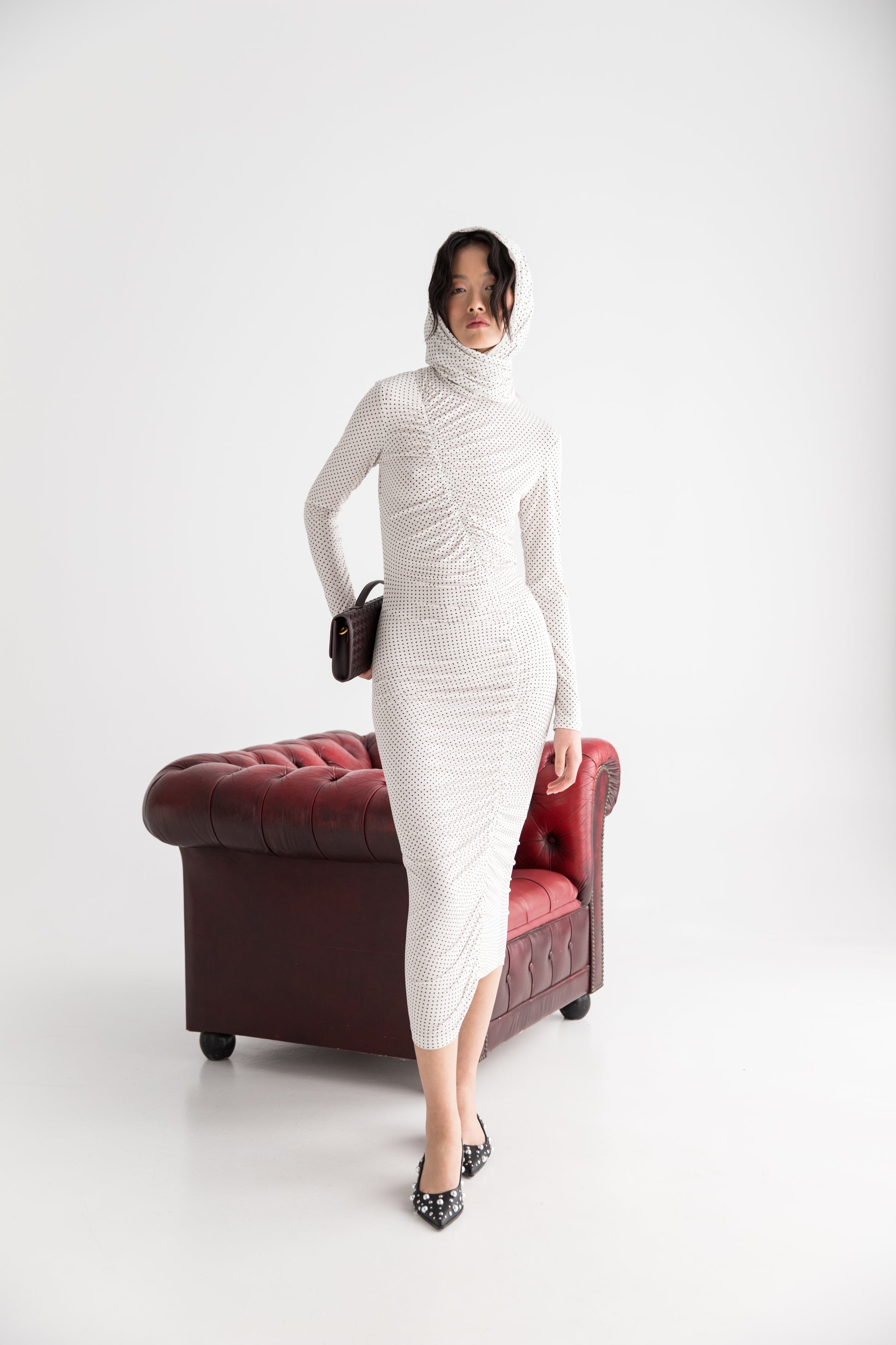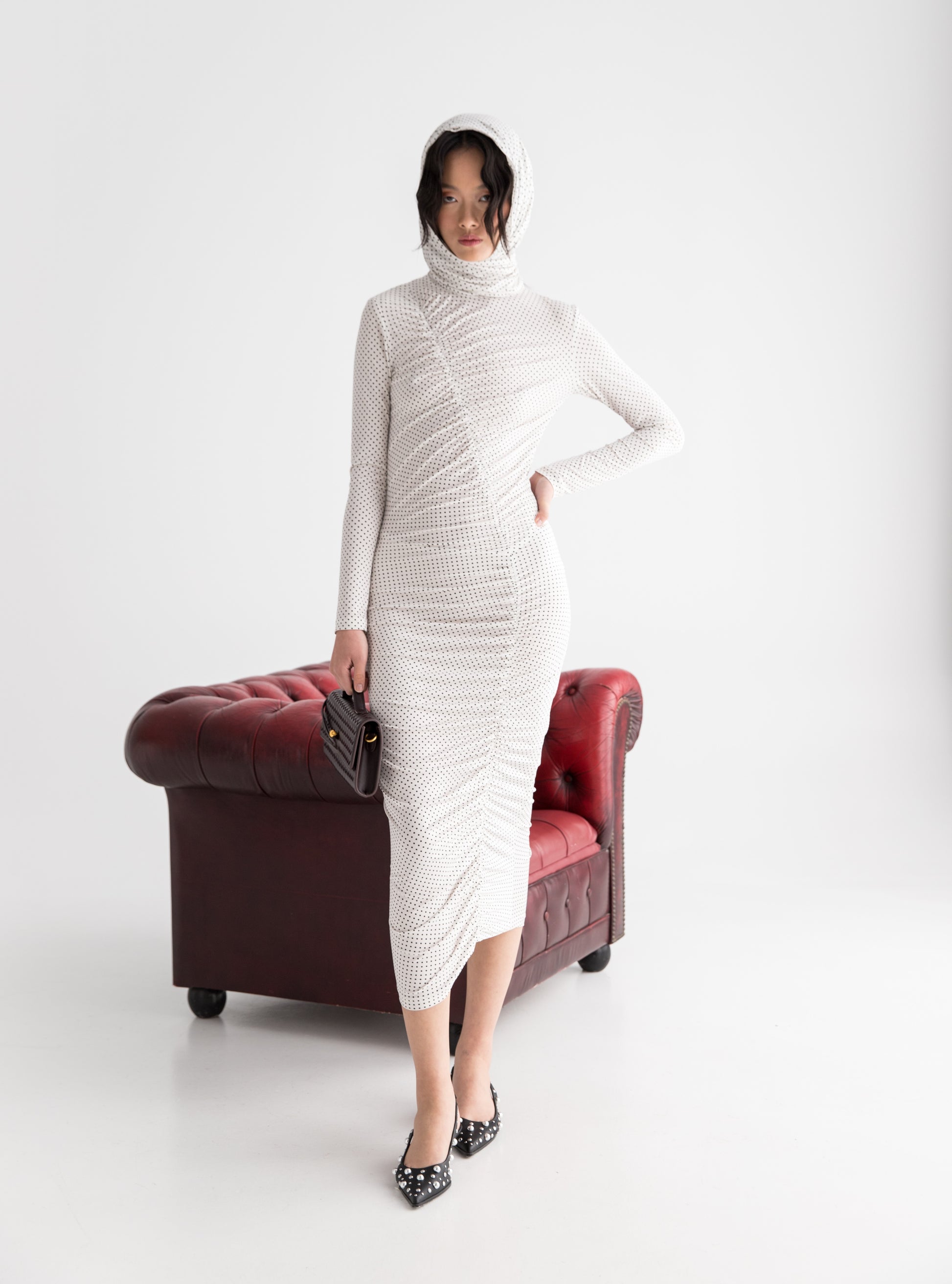 A contemporary ode to classic polka dots , the Biarritz dress blends timeless elegance with modern allure . Designed in a sculpting silhouette with gathered details that flatter the body , ti carries an understated sophistication . The hooded neckline adds a touch of mystique . Perfect for both day-to-night moments . Biarritz is a refined essential of the Edition Luxe .