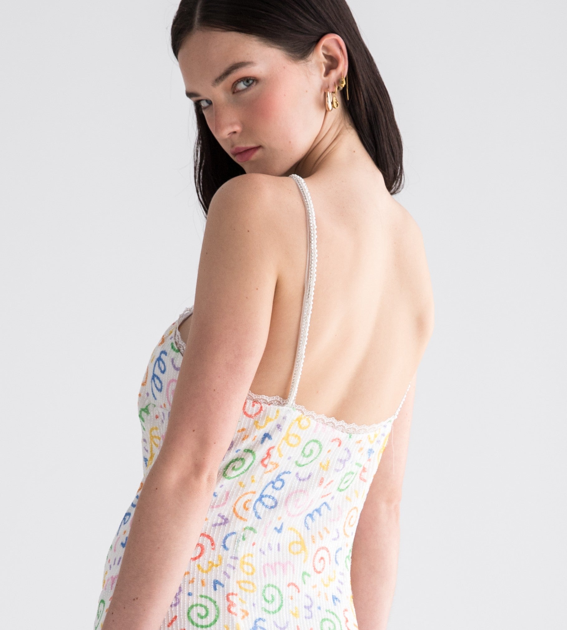 A shimmering mini dress adorned with sequins and pearl straps, featuring the signature ST confetti print.