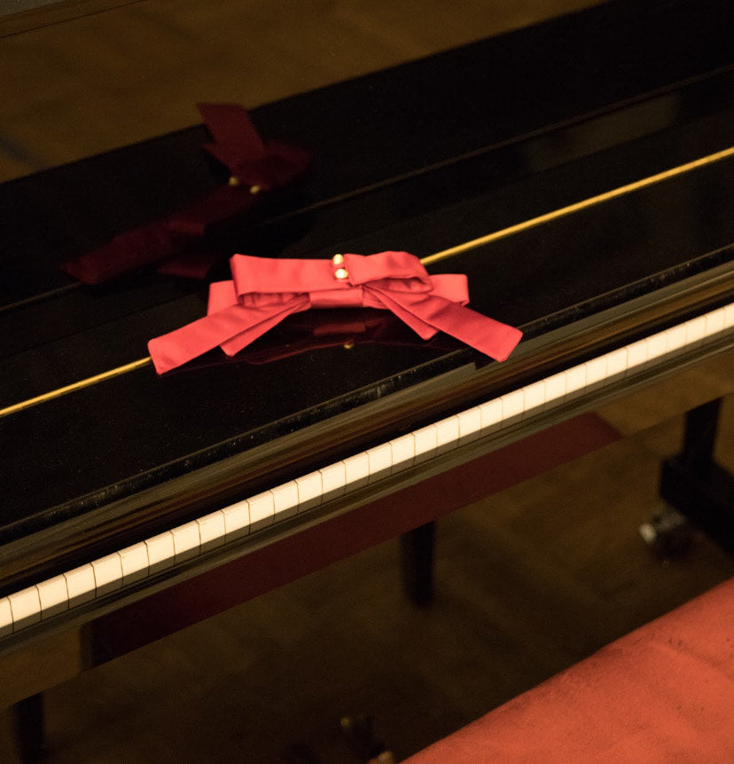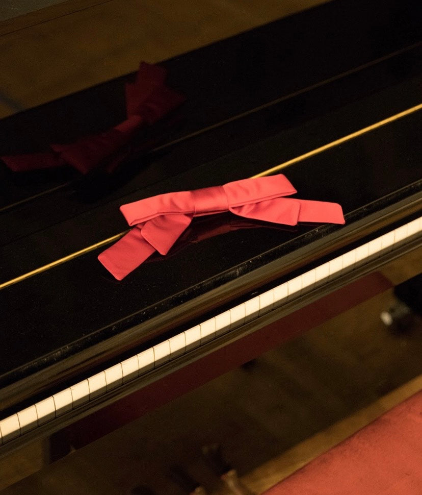 A luxurious long gown crafted from delicate French lace, finished with a bold red bow at the neckline.