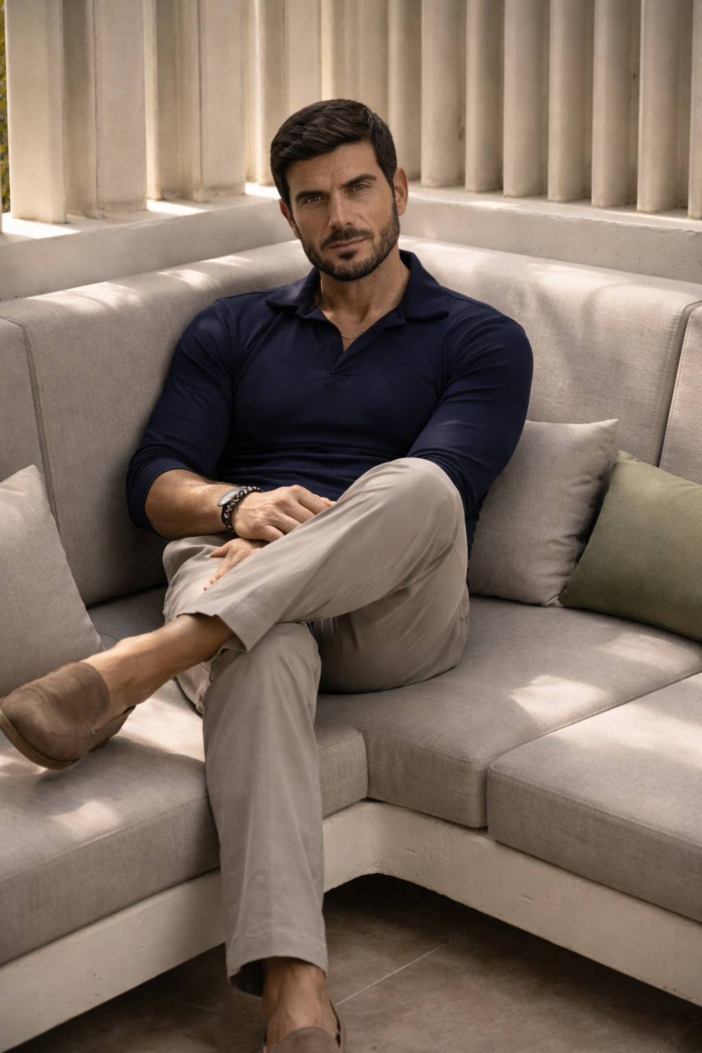 The Harbour Polo .Inspired by navy tones and moored elegance — relaxed yet structured.